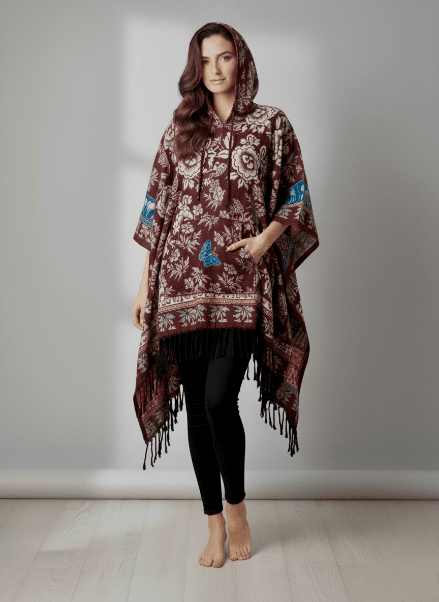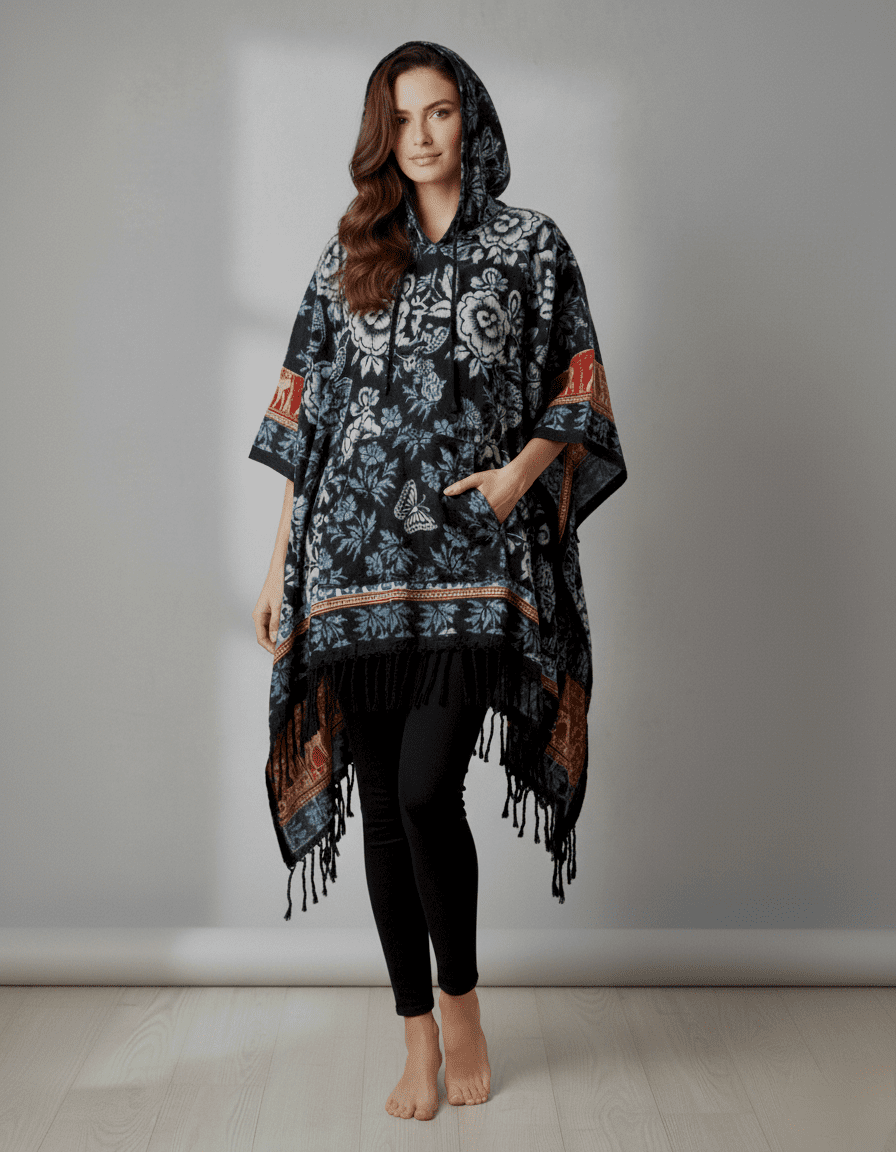 floral motifs, delicate butterflies, and traditional geometric patterns. The rich color palette, typically combining deep blacks with contrasting white/grey, vibrant orange/red, and refreshing blue/teal, creates a visually stunning and versatile garment. Crafted from a soft, lightweight, and breathable fabric (likely a cotton blend or similar comfortable textile), these ponchos are designed for supreme comfort and ease of wear, making them ideal for layering or as a standalone statement piece. The integrated hood provides practical appeal and adds a casual, stylish element, while the generously fringed hem enhances its bohemian and free-spirited charm. The overall presentation, with its refined patterns and comfortable feel, positions it as a premium offering that delivers both style and value for your customers. This product is perfect for brands catering to a clientele that appreciates unique, artistically inspired, and comfortable fashion.