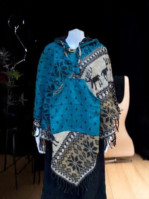 Each poncho features a striking combination of traditional geometric patterns and charming reindeer motifs, creating a visually appealing and thematic design. Crafted from soft, durable fabric, these ponchos provide excellent insulation and comfort, ideal for colder climates. The integrated hood adds practicality and an extra layer of warmth, while the fringed hem enhances its bohemian and cozy appeal.